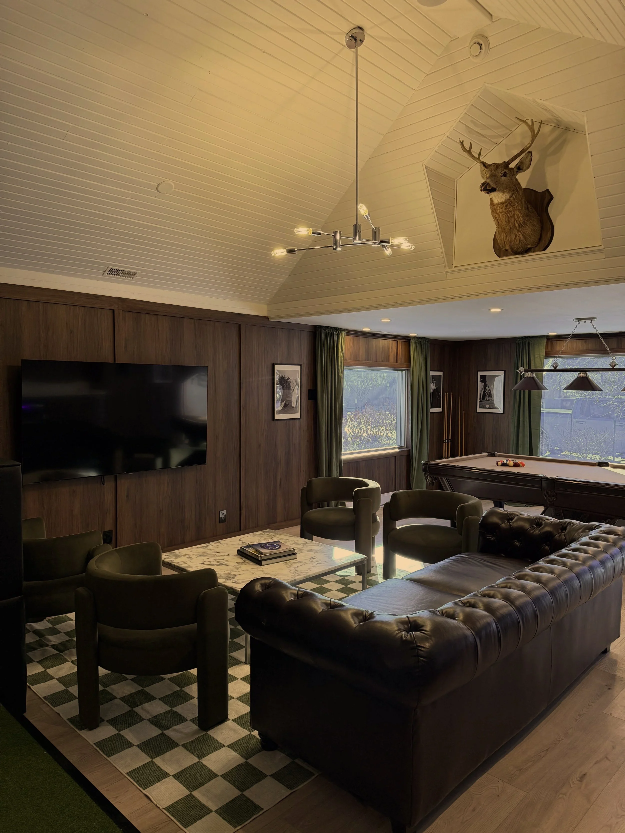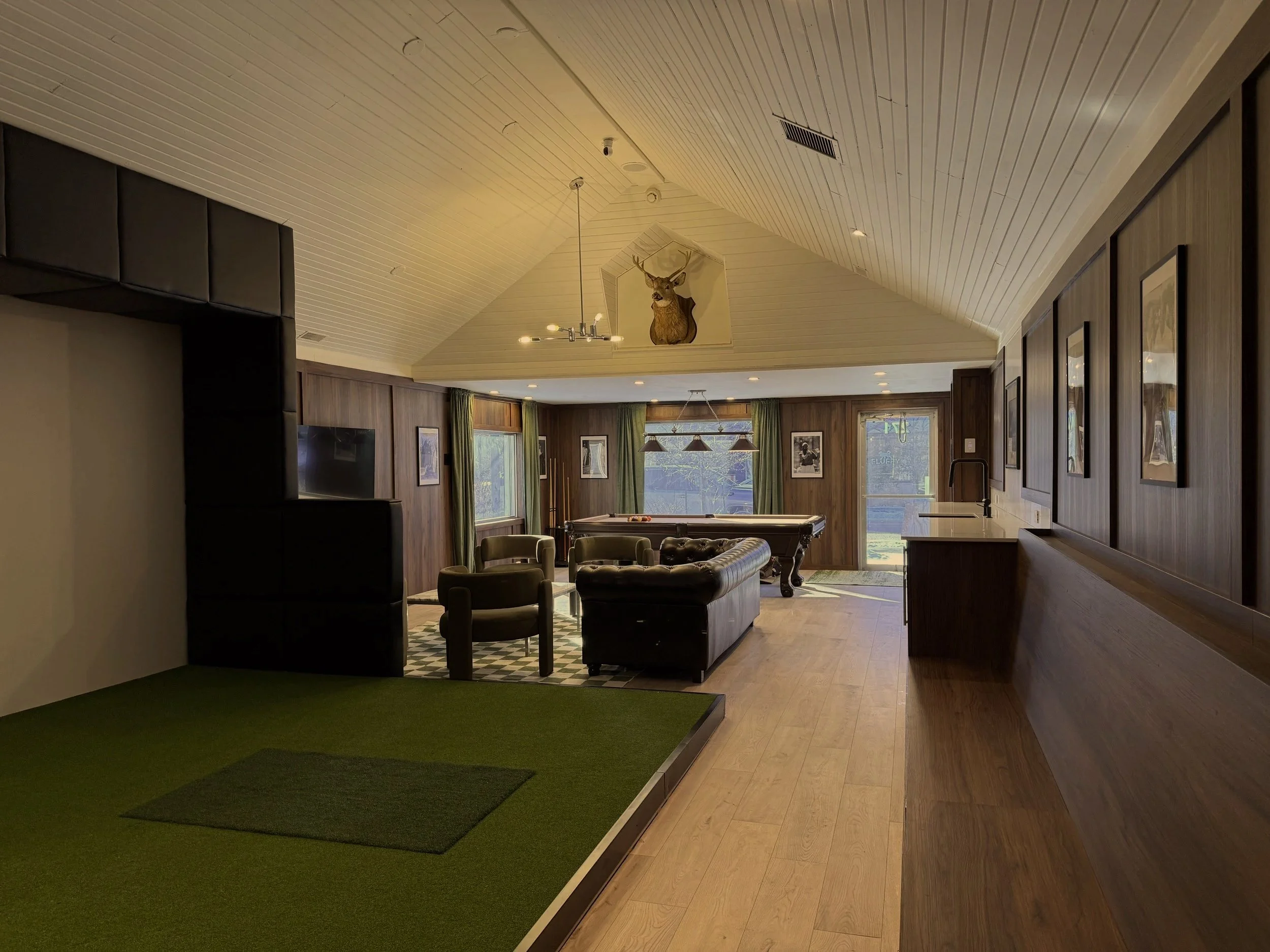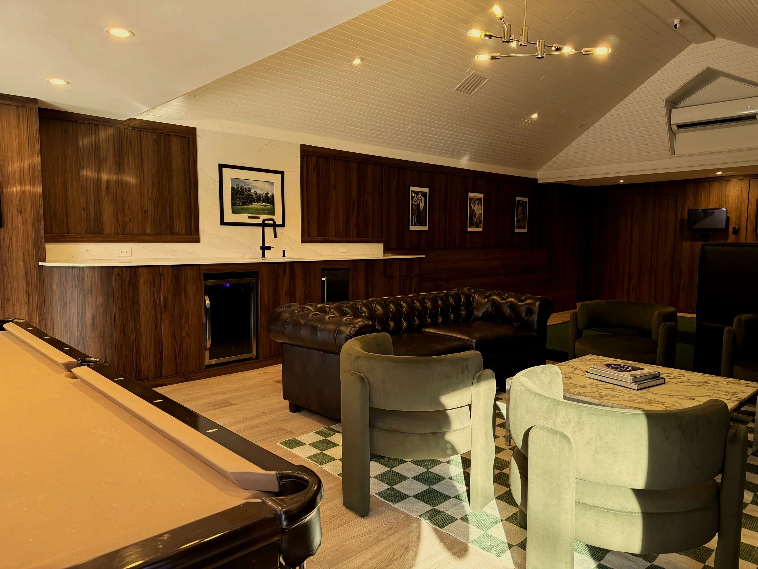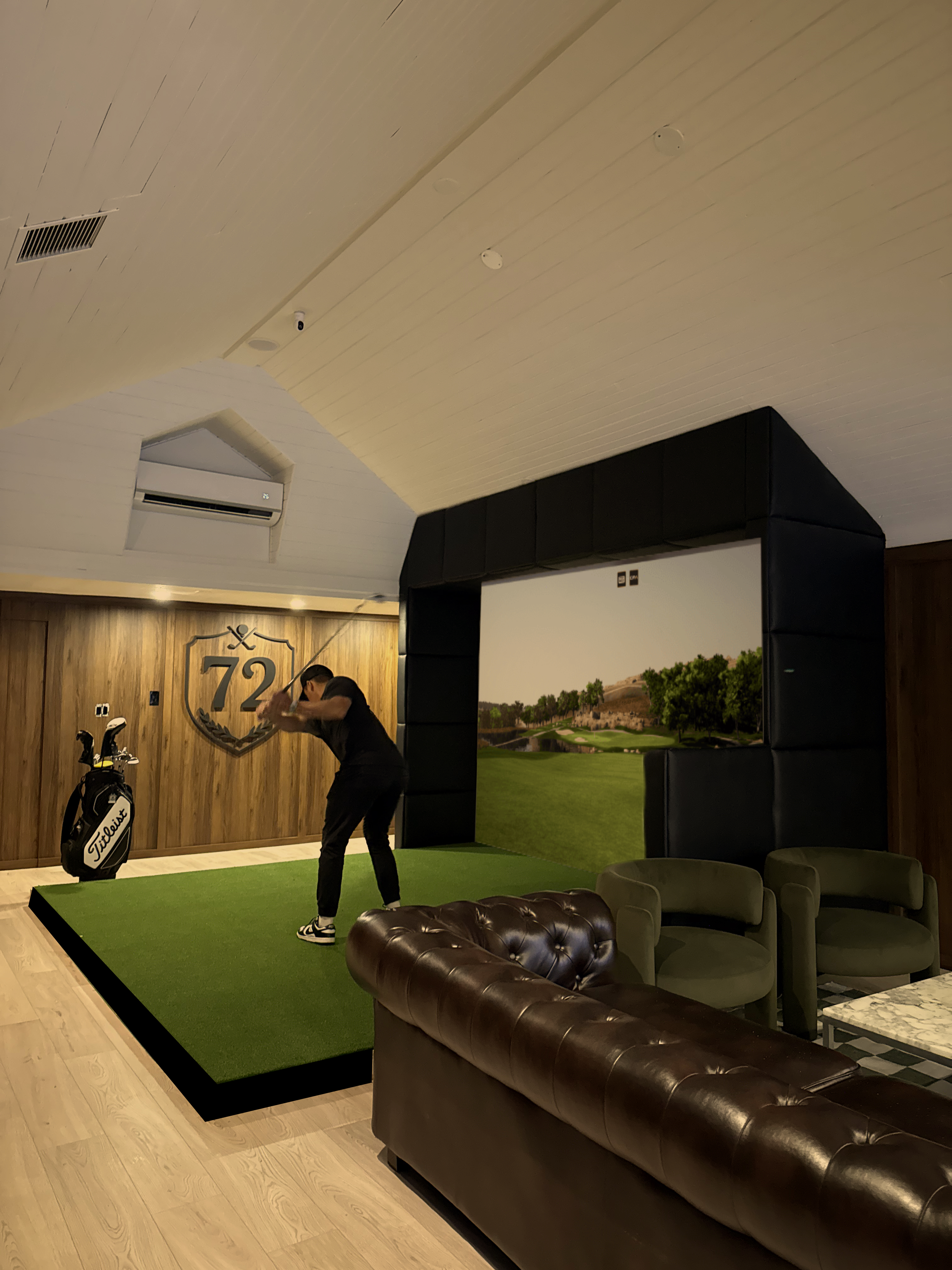 La salle est équipée d'un simulateur de golf haut de gamme, un espace lounge avec écran géant, une table de pool et un espace bar intégré.